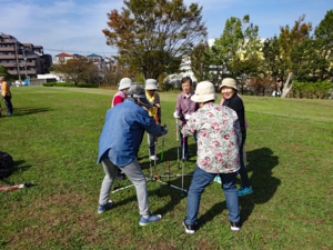 秋の穏やかな天候に恵まれて鶴ヶ峰駅から長坂谷公園を訪ねました。運動公園では、サッカー・野球に家族の声援が、遊具のある広場は子供の声が響きわたる。私達は広大な芝生広場でノルディックウォーキングゲームです。参加者はゲームを楽しみ笑い声が溢れました。