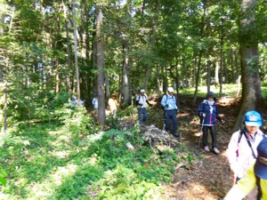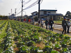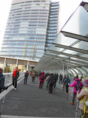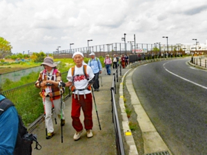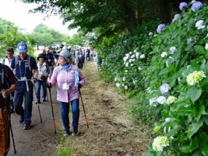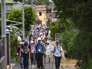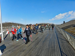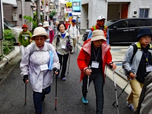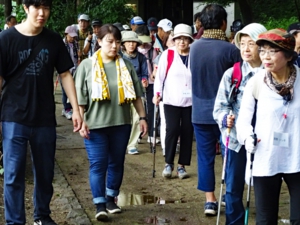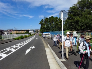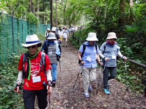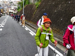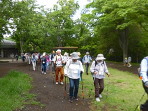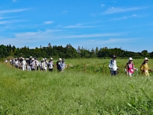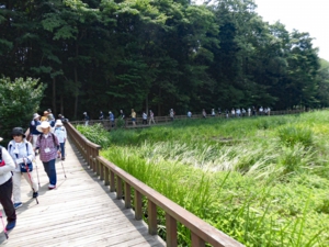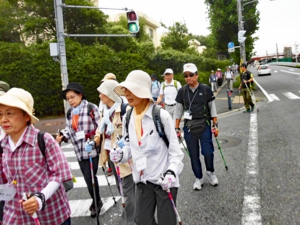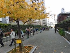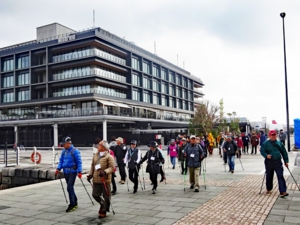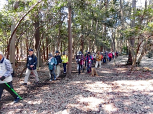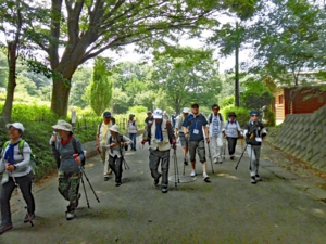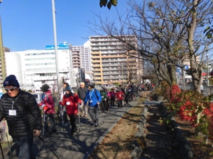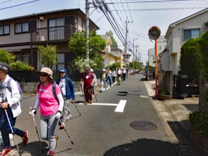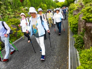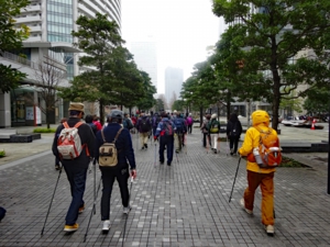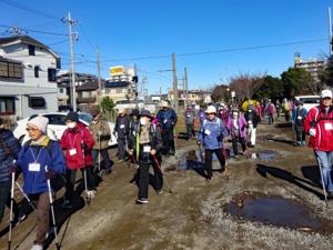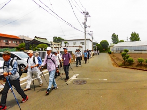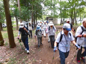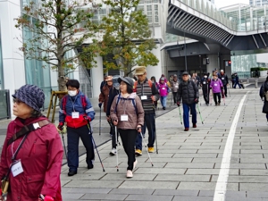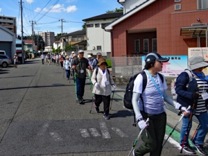 大人数で長い列、 前後でスタッフが細心の注意を払いながらのノルディックウォーキングでした。