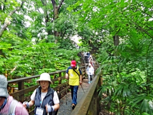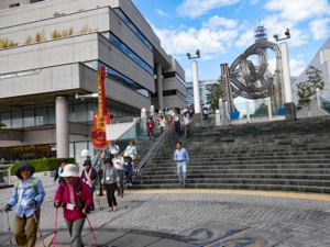 昨晩の雨で会談もぬれている。足元に注意して円形広場の階段を下りる参加者の皆さん
